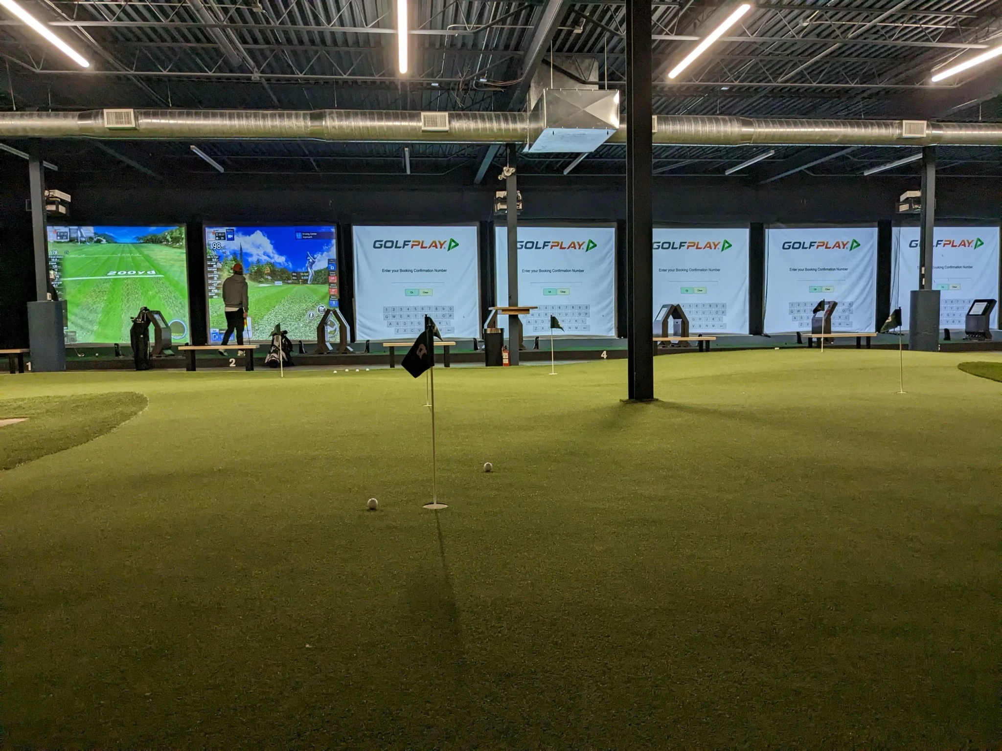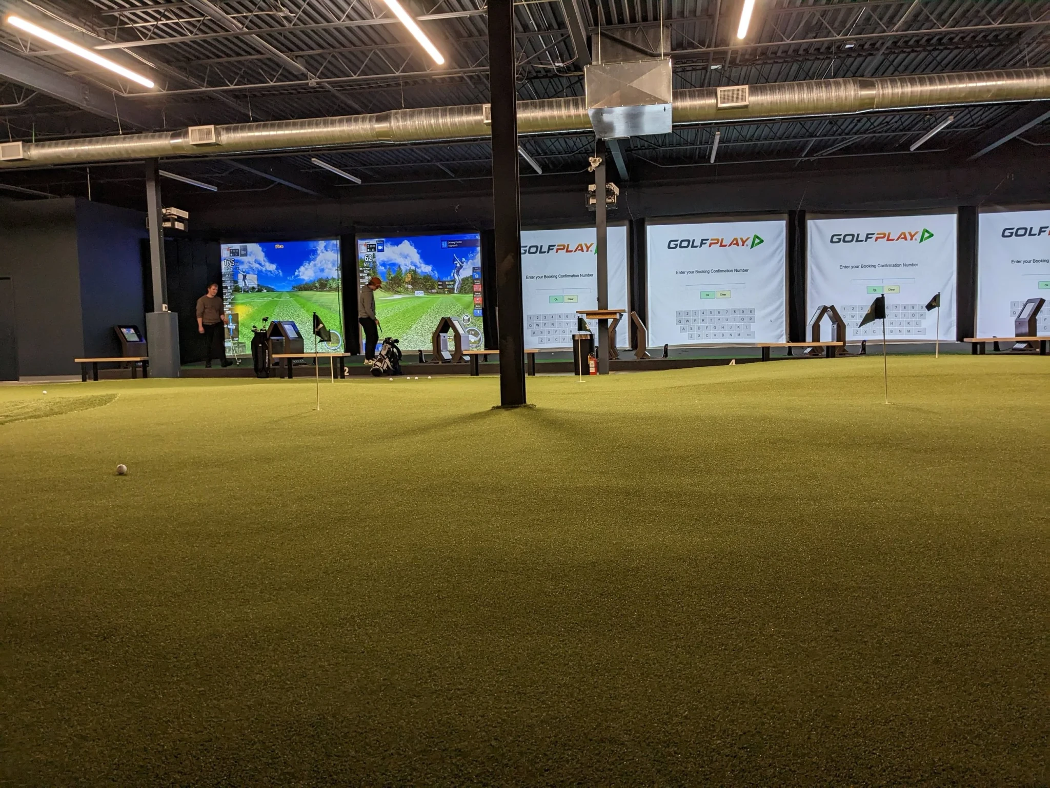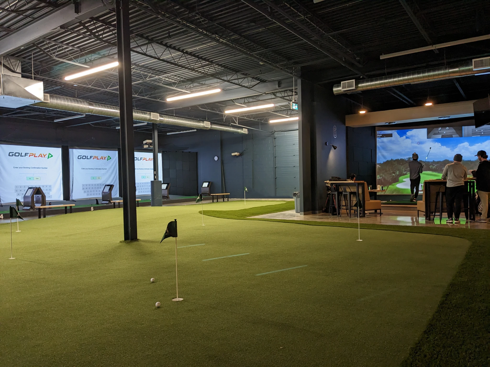 Indoor golf entertainment and practice facility, 2,500 sqft artificial turf putting green and simulators.
