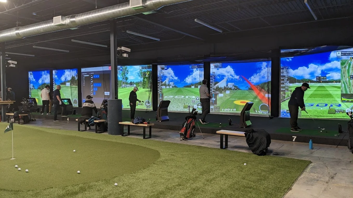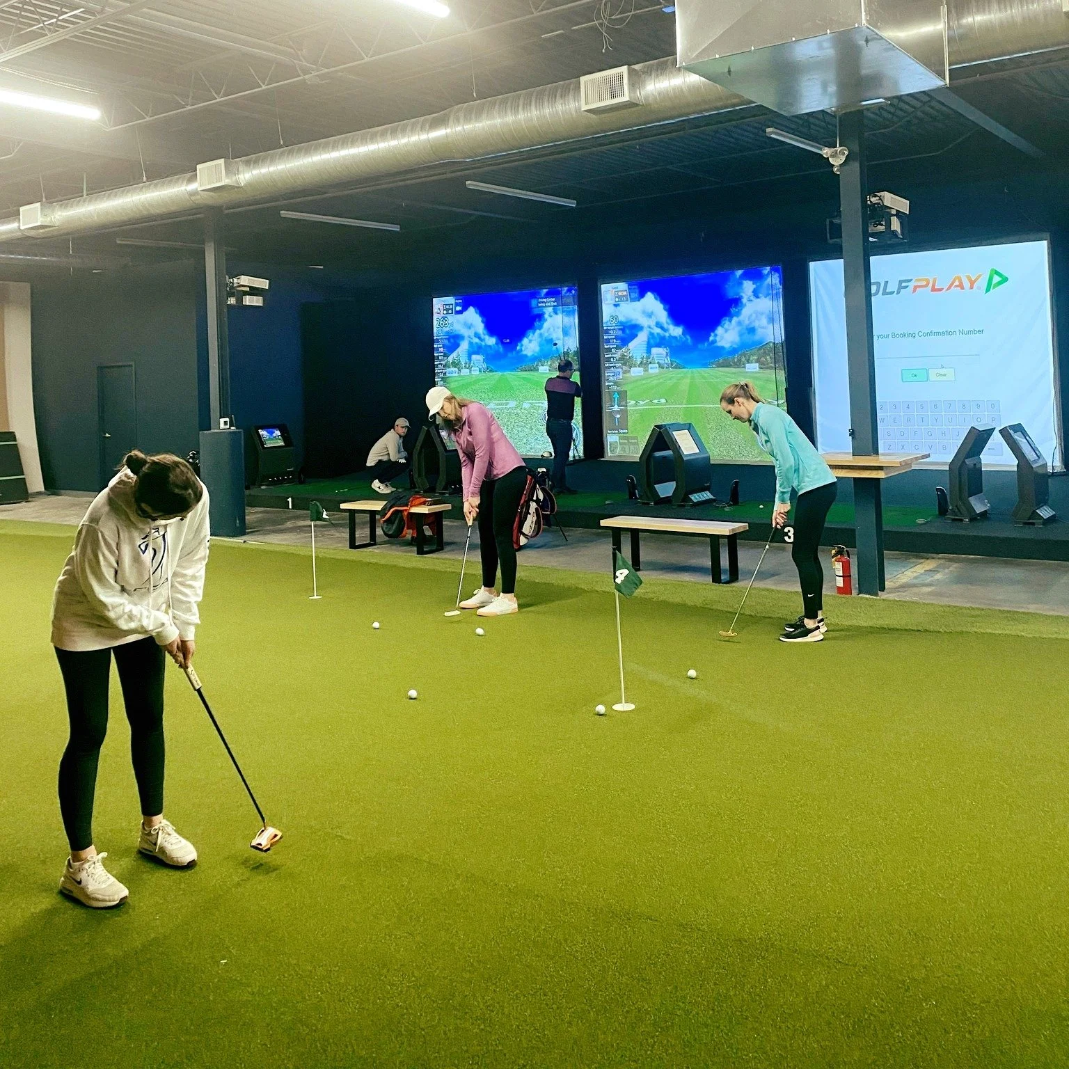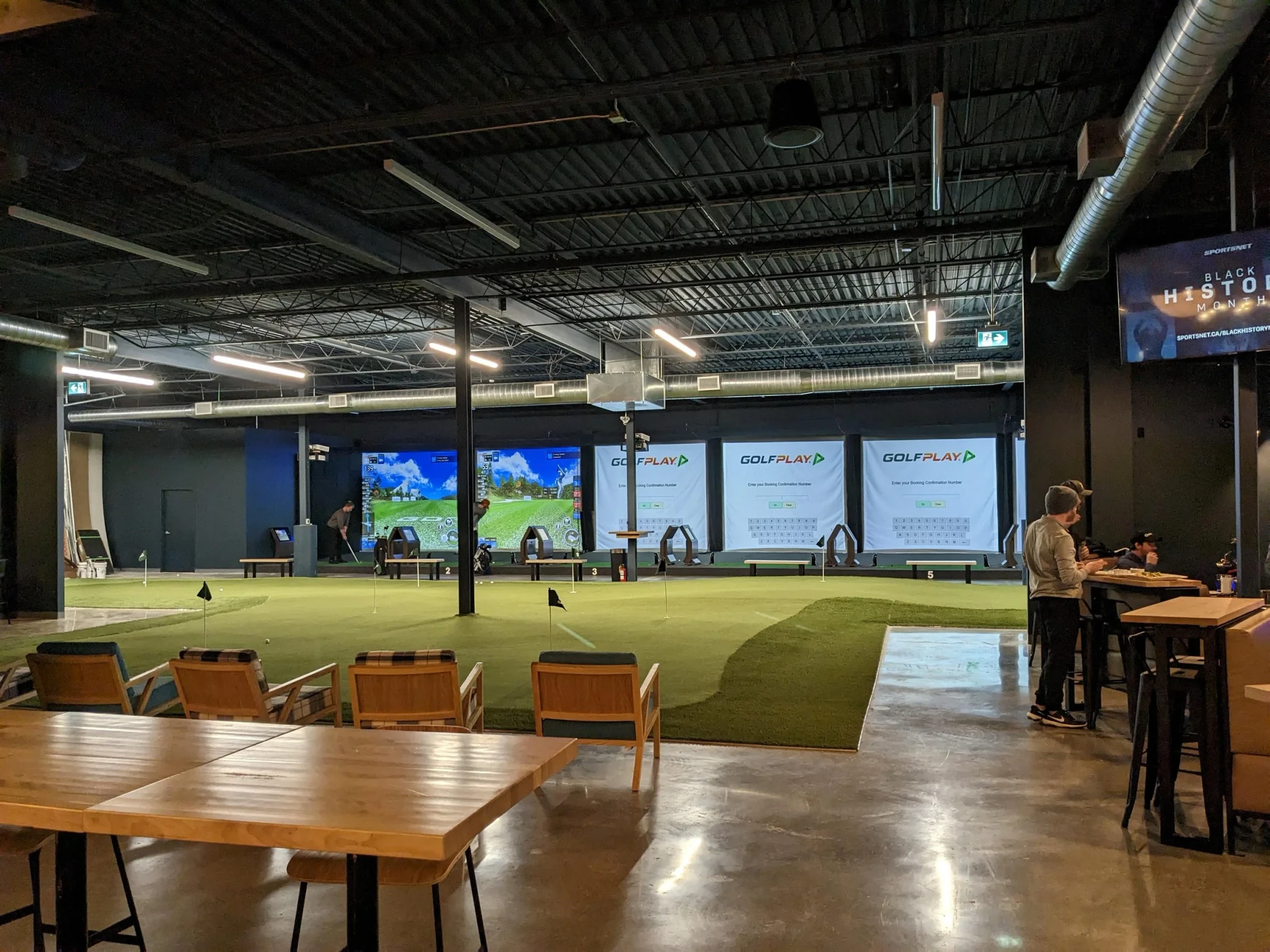 Indoor golf entertainment and practice facility, 2,500 sqft artificial turf putting green and simulators.