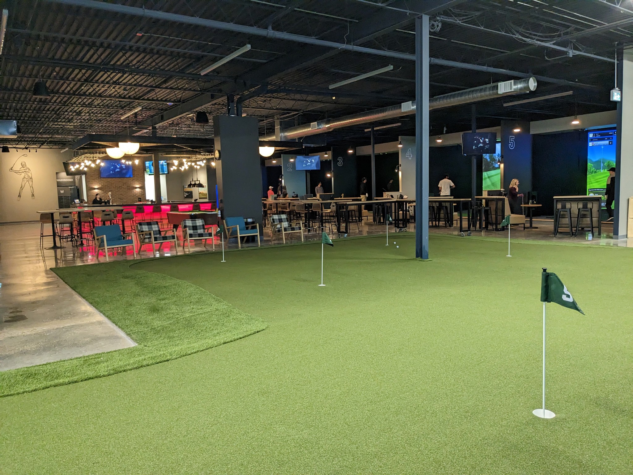 This indoor golf entertainment and practice facility, features an artificial turf putting green and simulators.