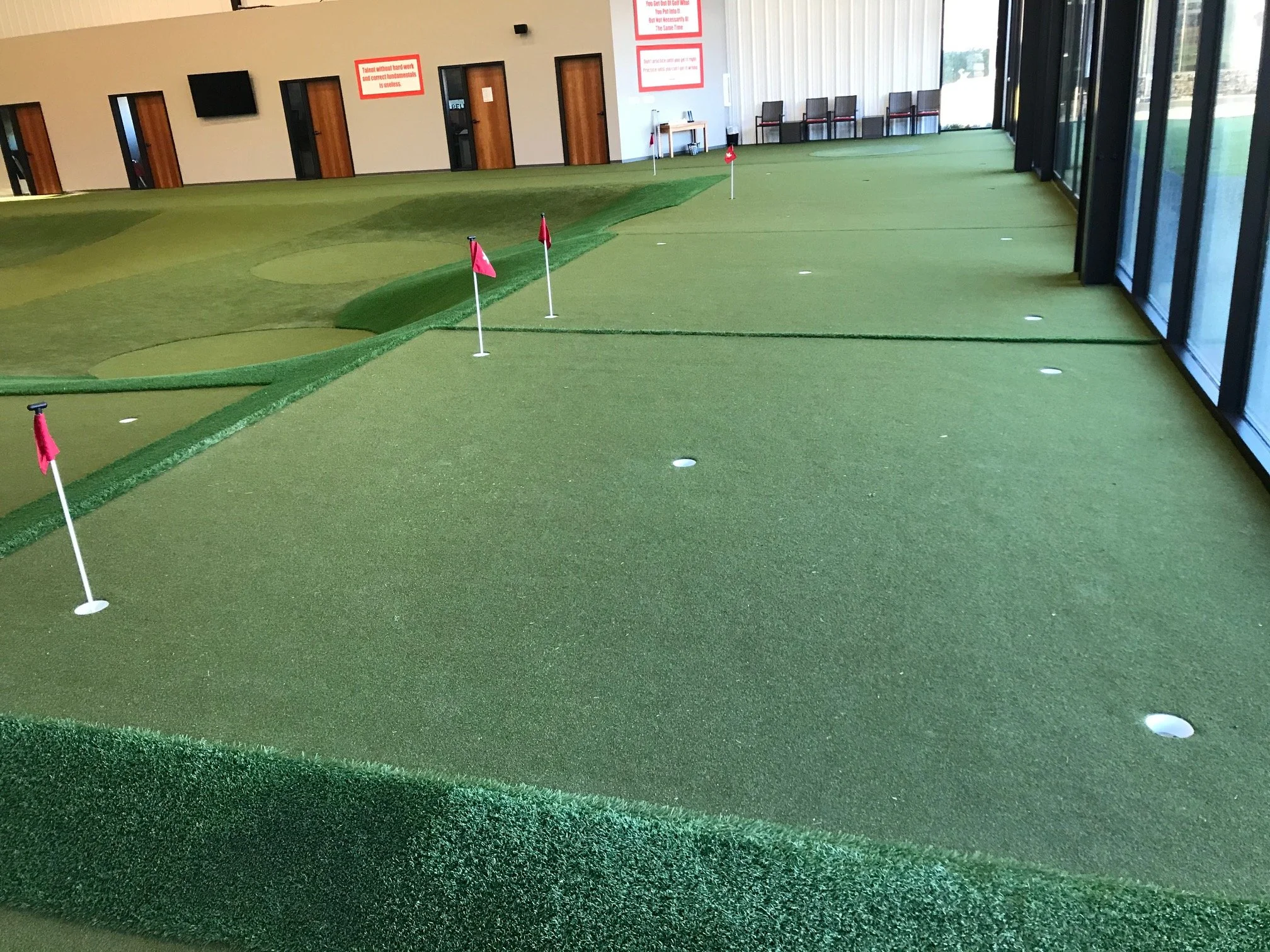 The University of Arkansas asked for a state-of-the-art indoor golf facility for the NCAA Razorbacks Golf Team designed to replicate outdoor conditions with advanced synthetic turf and technology, offering year-round practice opportunities. Additionally, we created a wedge calibration range to help players fine-tune their short game with precise wedge shot training, the same as in Dave Pelz’ world famous backyard training and research center, where Tour Player Champions prepare for the Majors.
